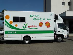 JA伊万里キャッチワード「ありがとう緑のぬくもり人へ社会へ」をボディーに掲げた「貯まるくん」が市内を巡回し、当座性貯金入出金や定期積金入金取引などの金融業務を行ないます。