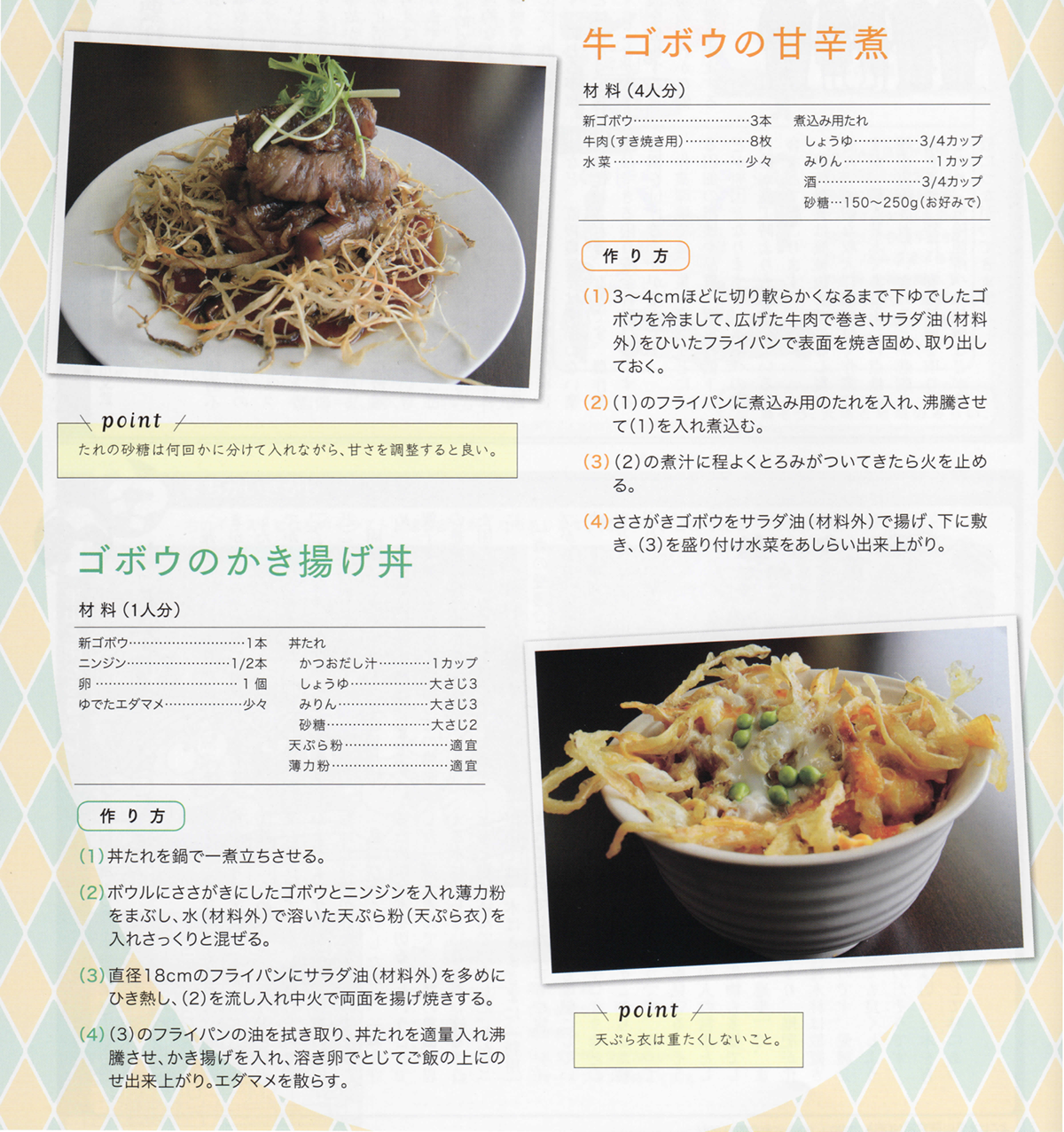牛ゴボウの甘辛煮とゴボウのかき揚げ丼