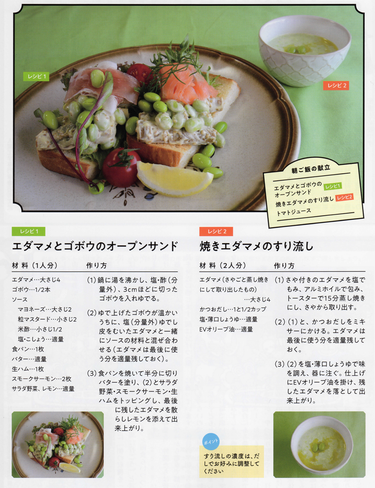 エダマメとゴボウのオープンサンドと焼きエダマメのすり流し