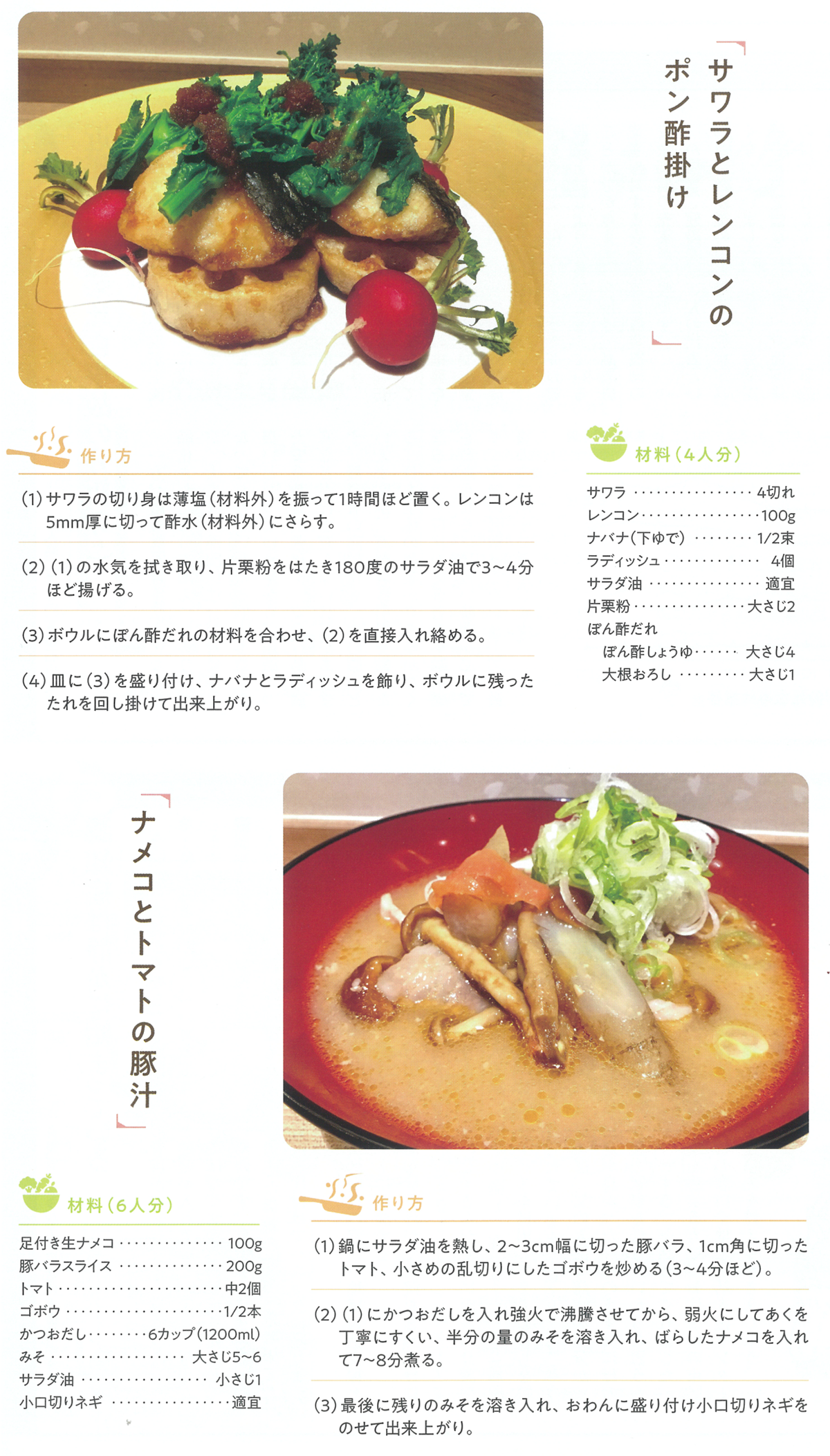 サワラとレンコンのポン酢掛けとナメコとトマトの豚汁