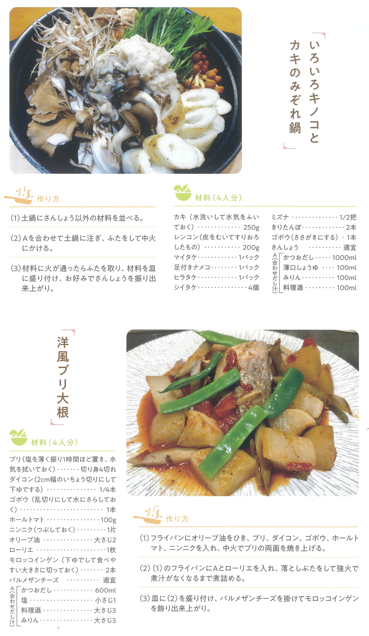 いろいろキノコとカキのみぞれ鍋と洋風ブリ大根