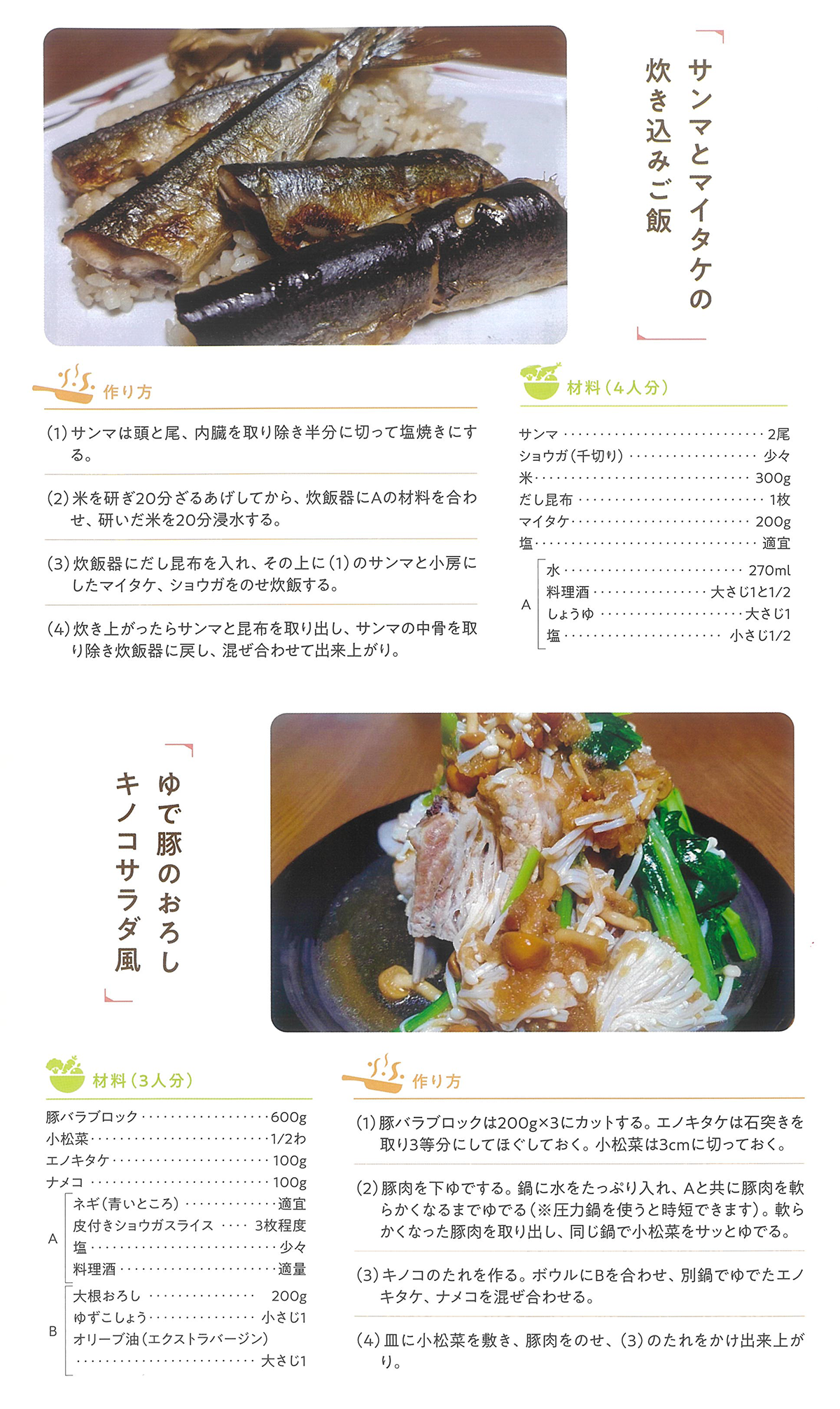 サンマとマイタケの焚き込みご飯とゆで豚のおろしキノコサラダ風