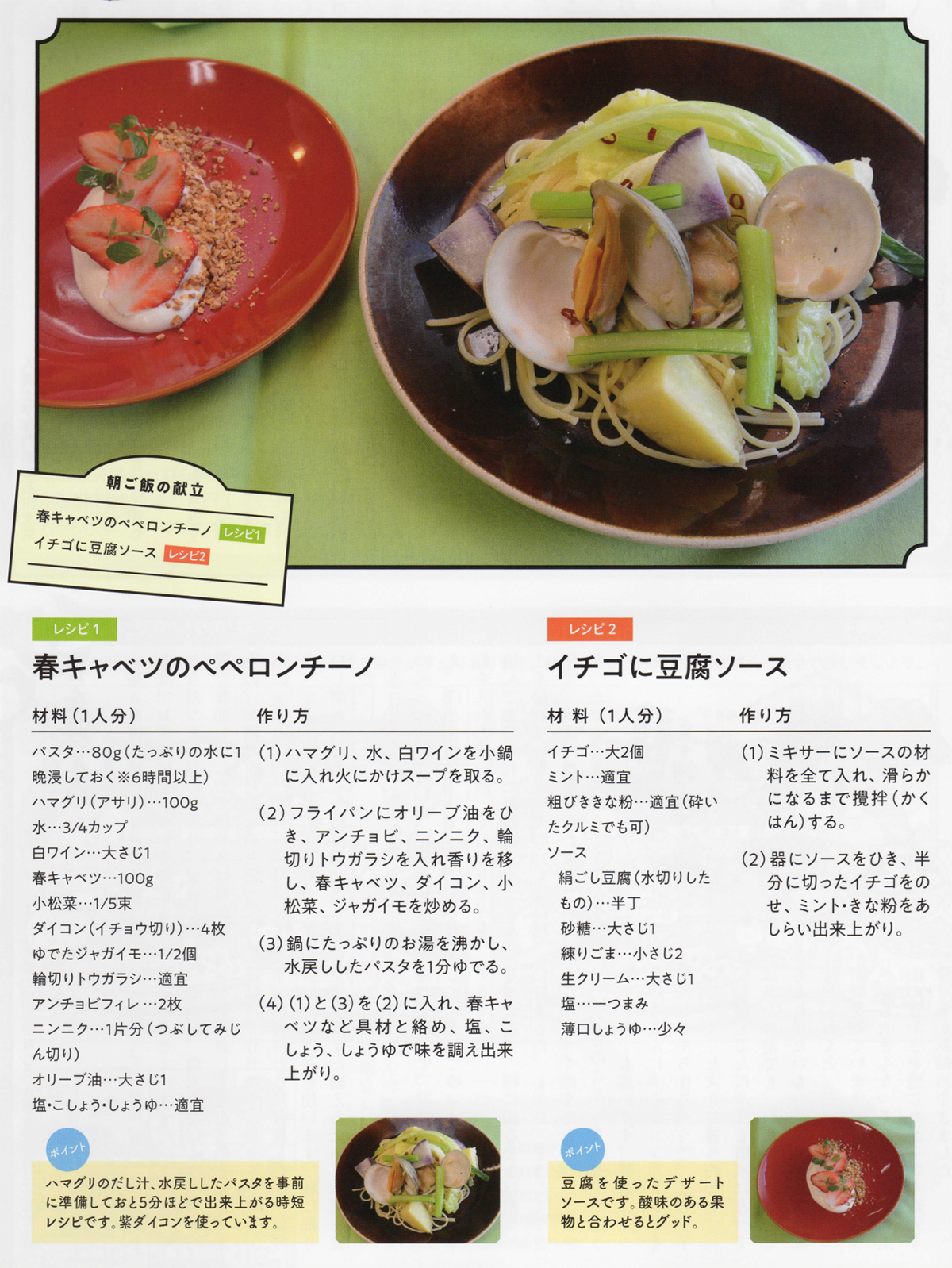 春キャベツのペペロンチーノとイチゴに豆腐ソース