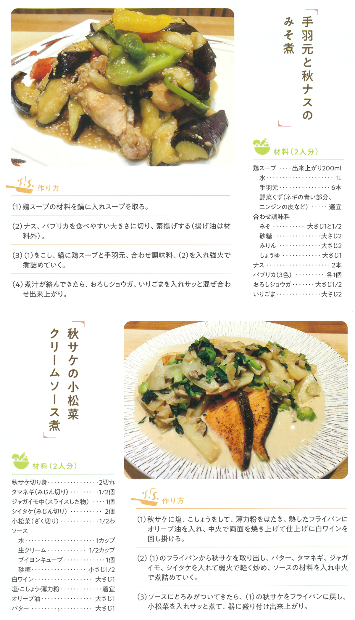 手羽元と秋ナスのみそ煮と秋サケの小松菜クリームソース煮